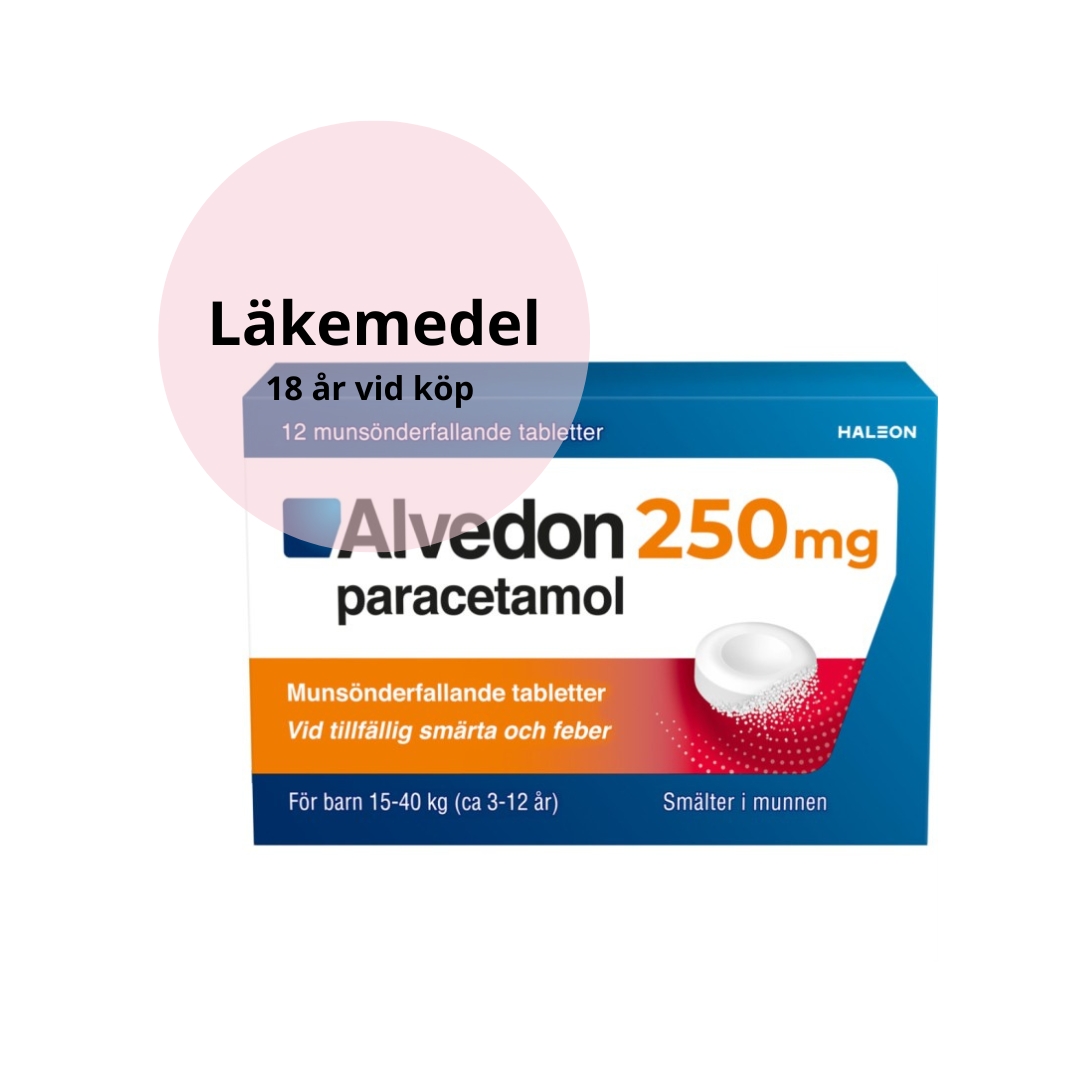 Alvedon Munsönderfallande tablett 250 mg använder du vid tillfällig smärta och feber. De munsönderfallande tabletterna smälter i munnen. För barn 15-40 kg (ca 3-12 år).