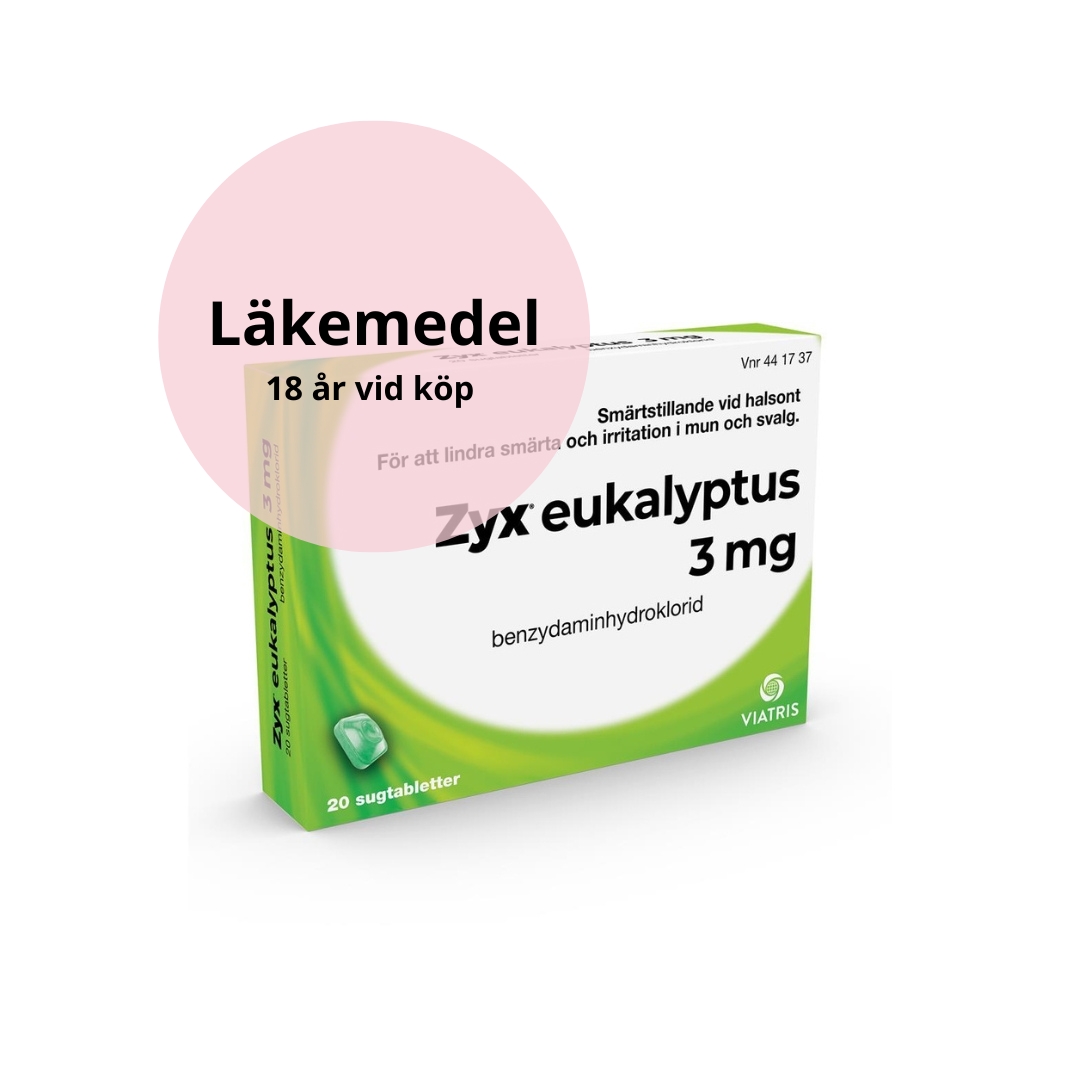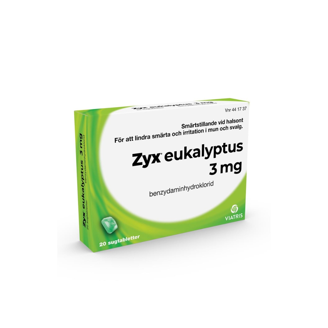 Zyx Eukalyptus är ett receptfritt läkemedel som du använder för att lindra smärta och irritation i mun och svalg. Sugtabletterna verkar smärtlindrande vid halsont.